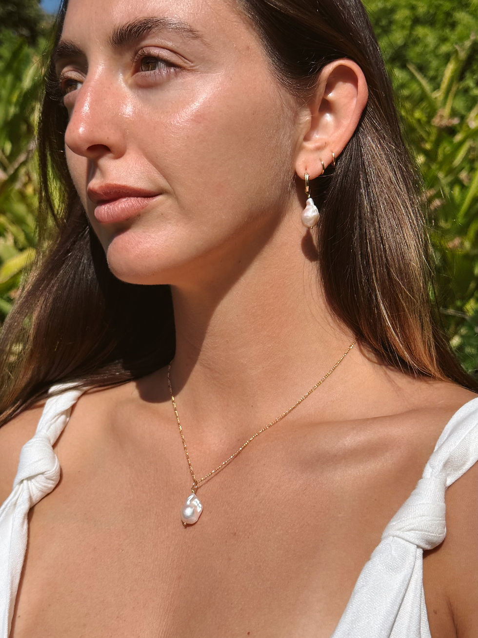 These earrings channel ethereal elegance with lustrous baroque pearls that shimmer with a soft pink sheen. Each natural pearl is unique, catching the light like sea foam at sunrise. A timeless yet modern piece, these hoops bring a touch of romance to any look.